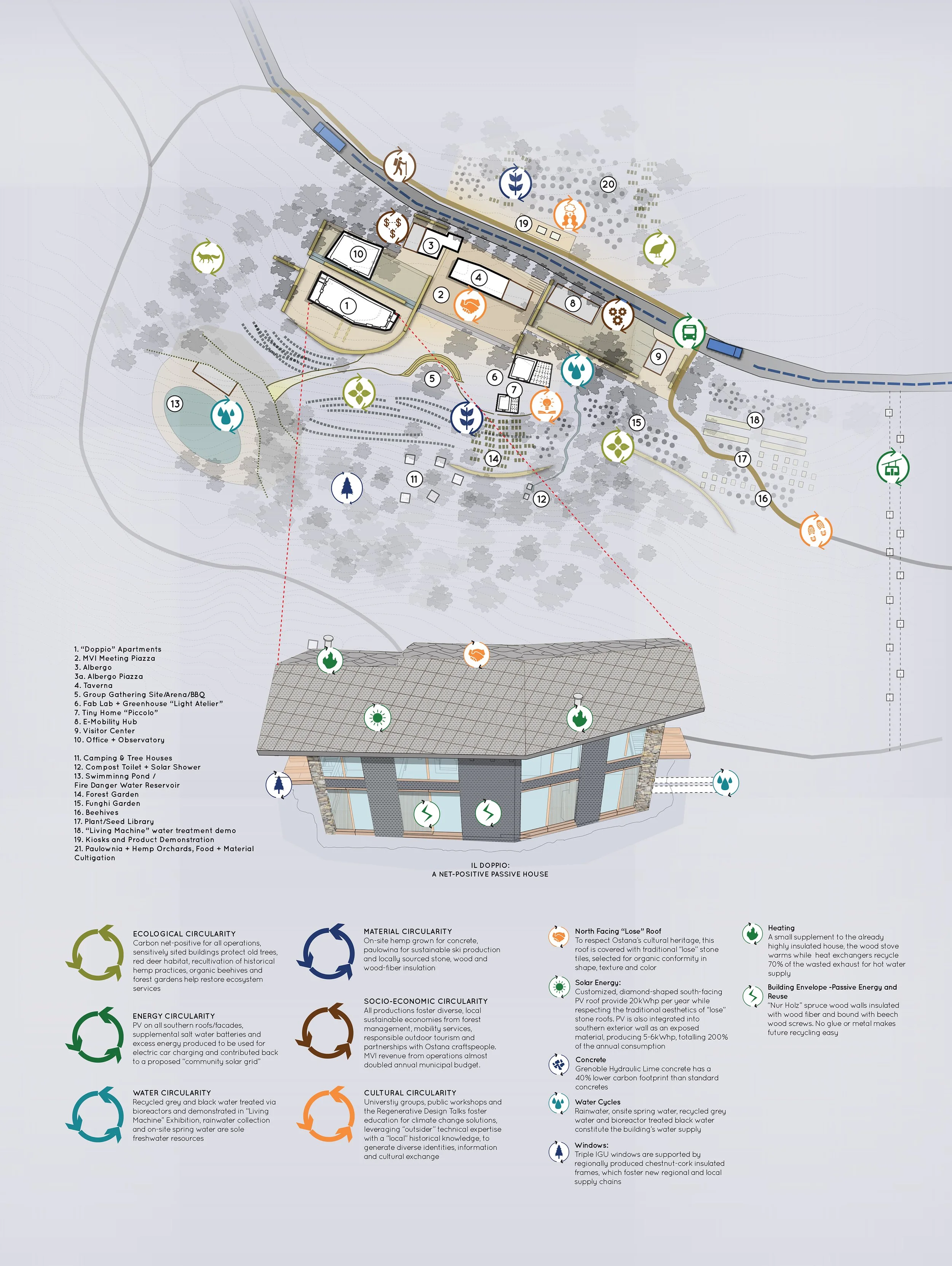 MVI Campus Masterplan showing circularity across ecological, material, socio-economic, and cultural systems, from permaculture landscapes to the “il Doppio” net-positive house. The campus includes eight buildings—lodge, cafeteria, workshop, art studio, observatory, and offices—currently being reconstructed from existing stone ruins.