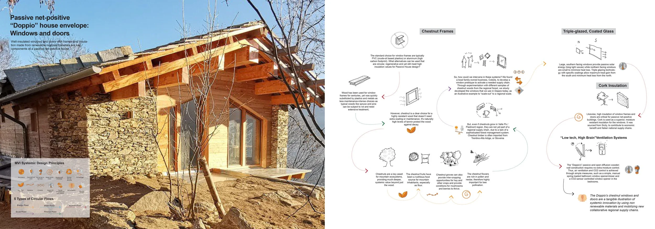Systemic design narratives, which I co-developed with Tobias Luthe, show how design decisions are embedded within larger social-ecological systems. This example illustrates how the regionally sourced windows and doors of the Il Doppio building are connected to local and regional supply chains, finances, cultural heritage and ecological benefits.